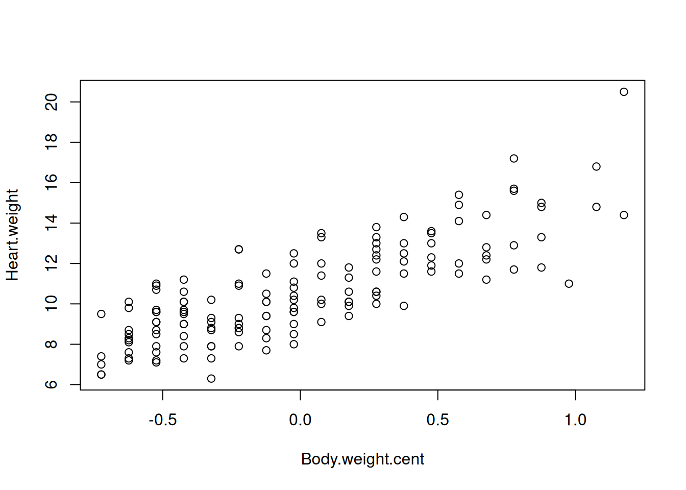 d.cats$Body.weight.cent <- d.cats$Body.weight -mean(d.cats$Body.weight)plot(Heart.weight ~ Body.weight.cent, data = d.cats)