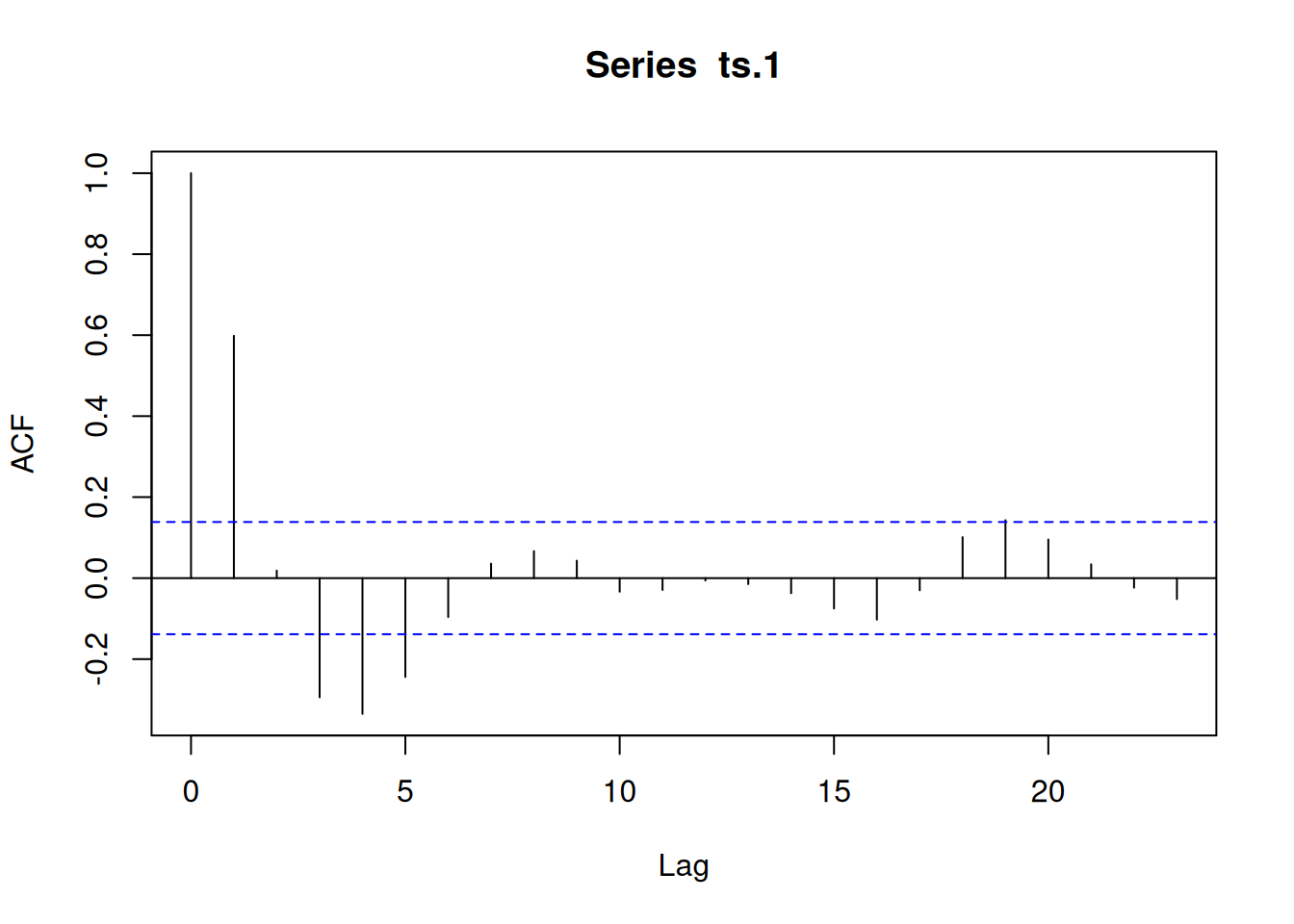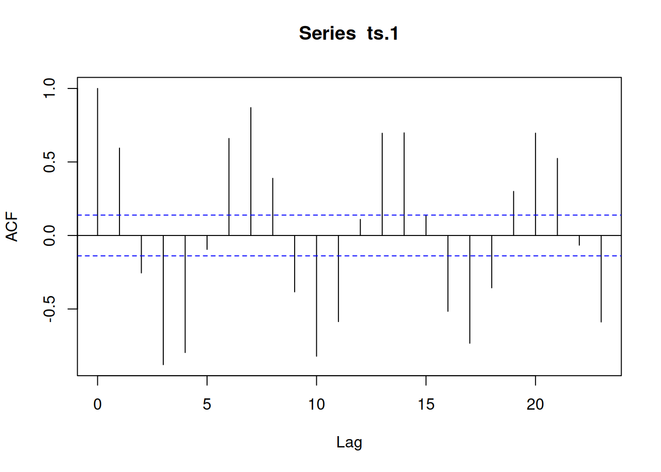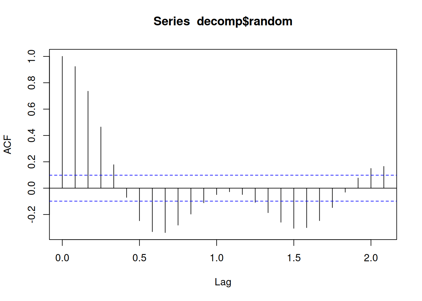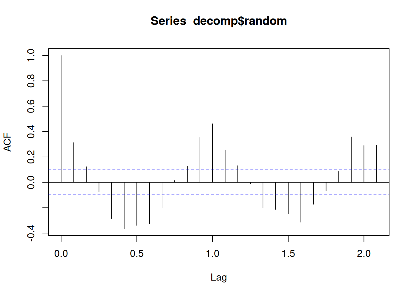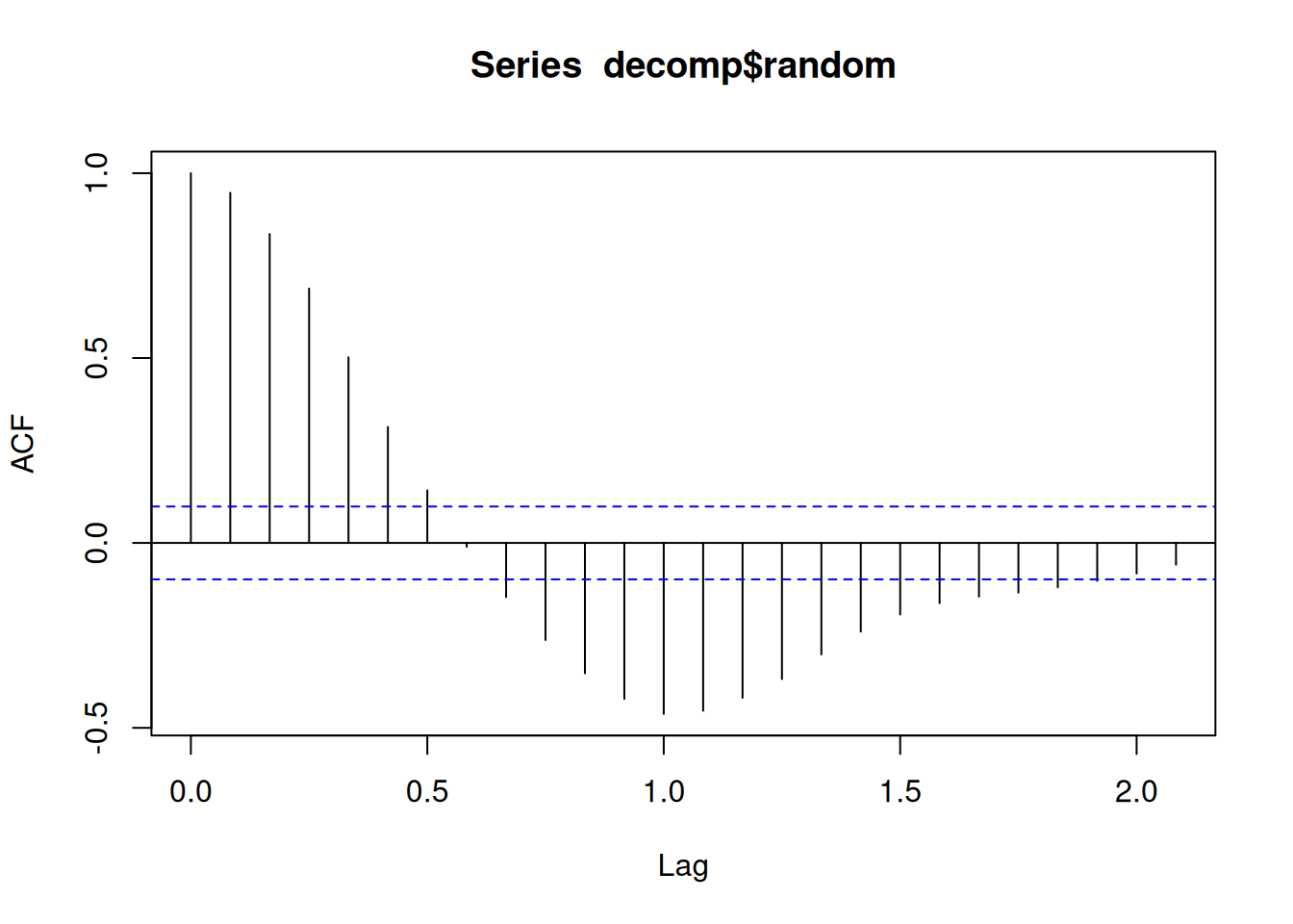 At this time, it is not advisable to examine the ACF because the time series is not stationary. We can see trends and seasonality over time. We need to clean that up first before analysing the time series.