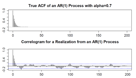 For stationary processes, plug-in estimator value \(\hat{p}(k)\) within the confidence band \(\pm \frac{1.96}{\sqrt{n}}\) are considered to be different from 0 only by chance.