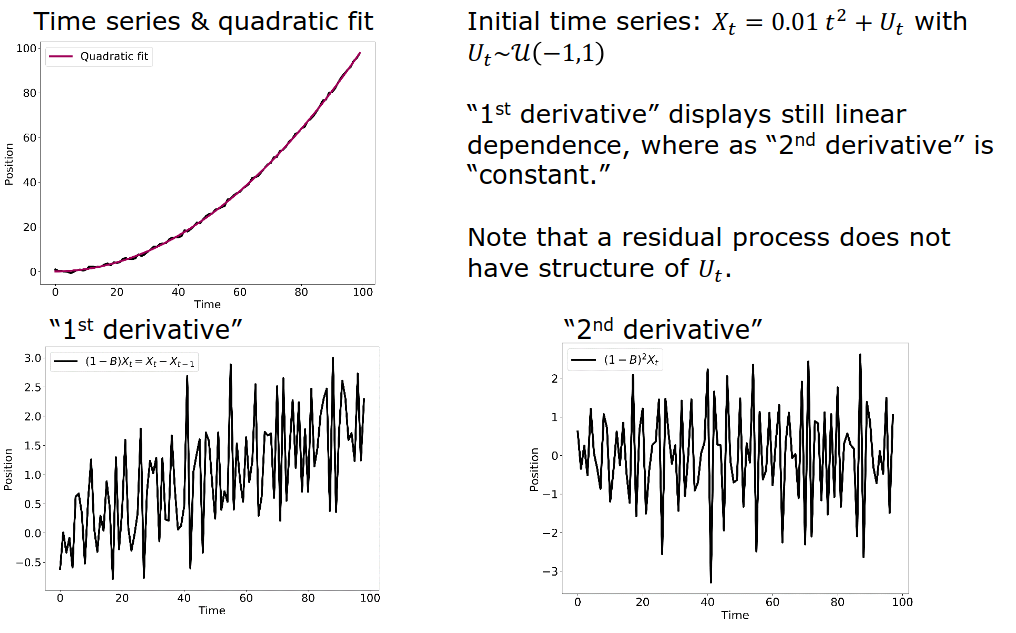 Use multiple derivatives to eliminate lower-order terms. Trend order is reduced, but the stationary part may be more complex. After trend is eliminated, maybe a new dependencies in the stationary part.