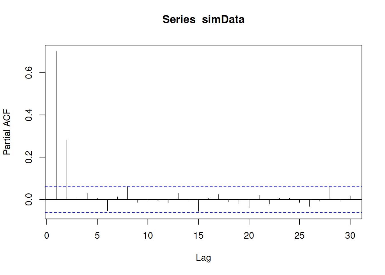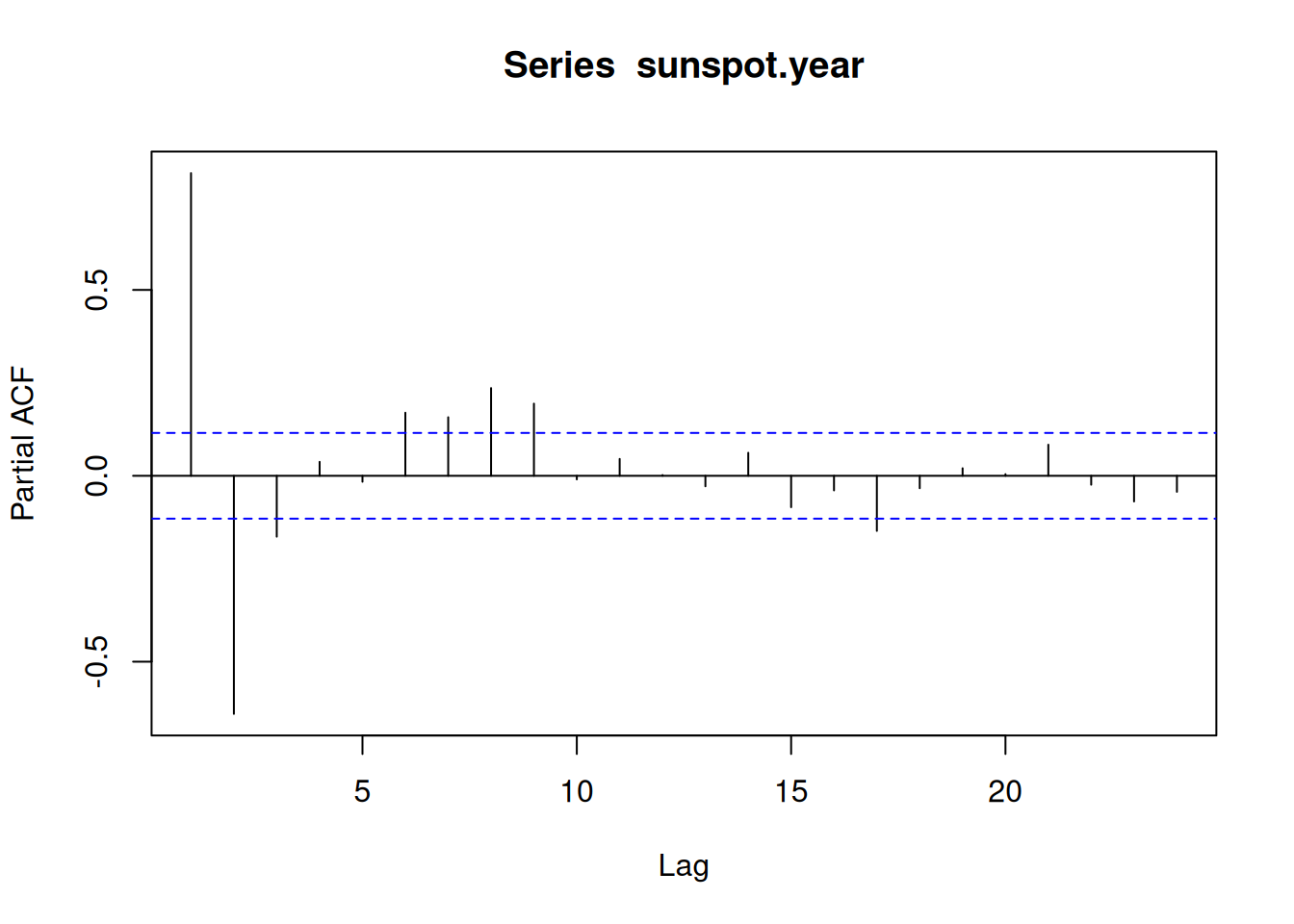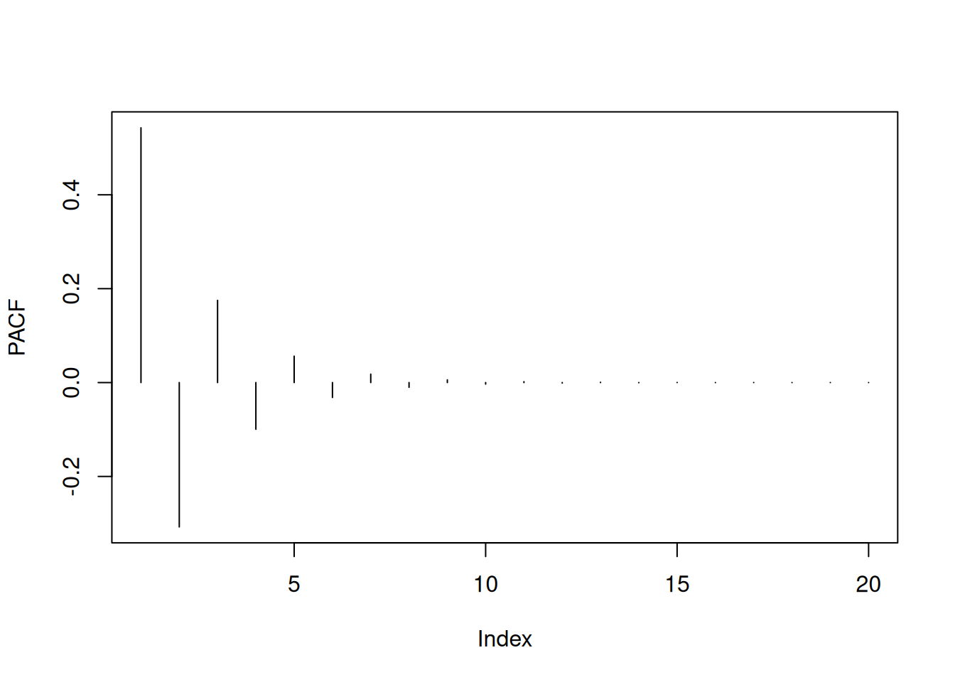 A challenge in the interpretation of ACFs is that the effect of smaller lags remains. The partial autocorrelation function (PACF) gives the partial correlation of a stationary time series with its own lagged values, regressed the values of the time series at all shorter lags.