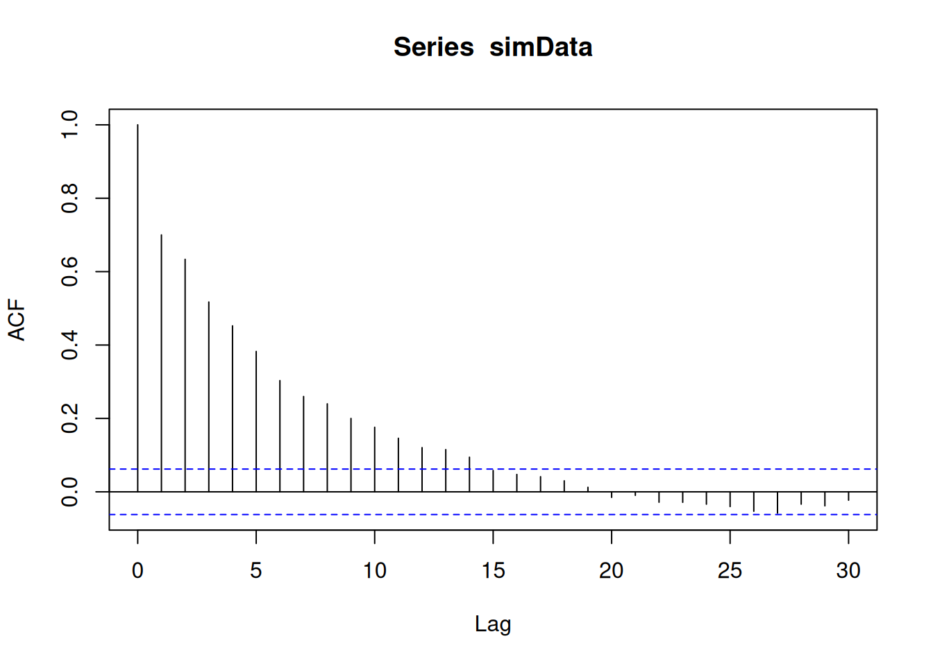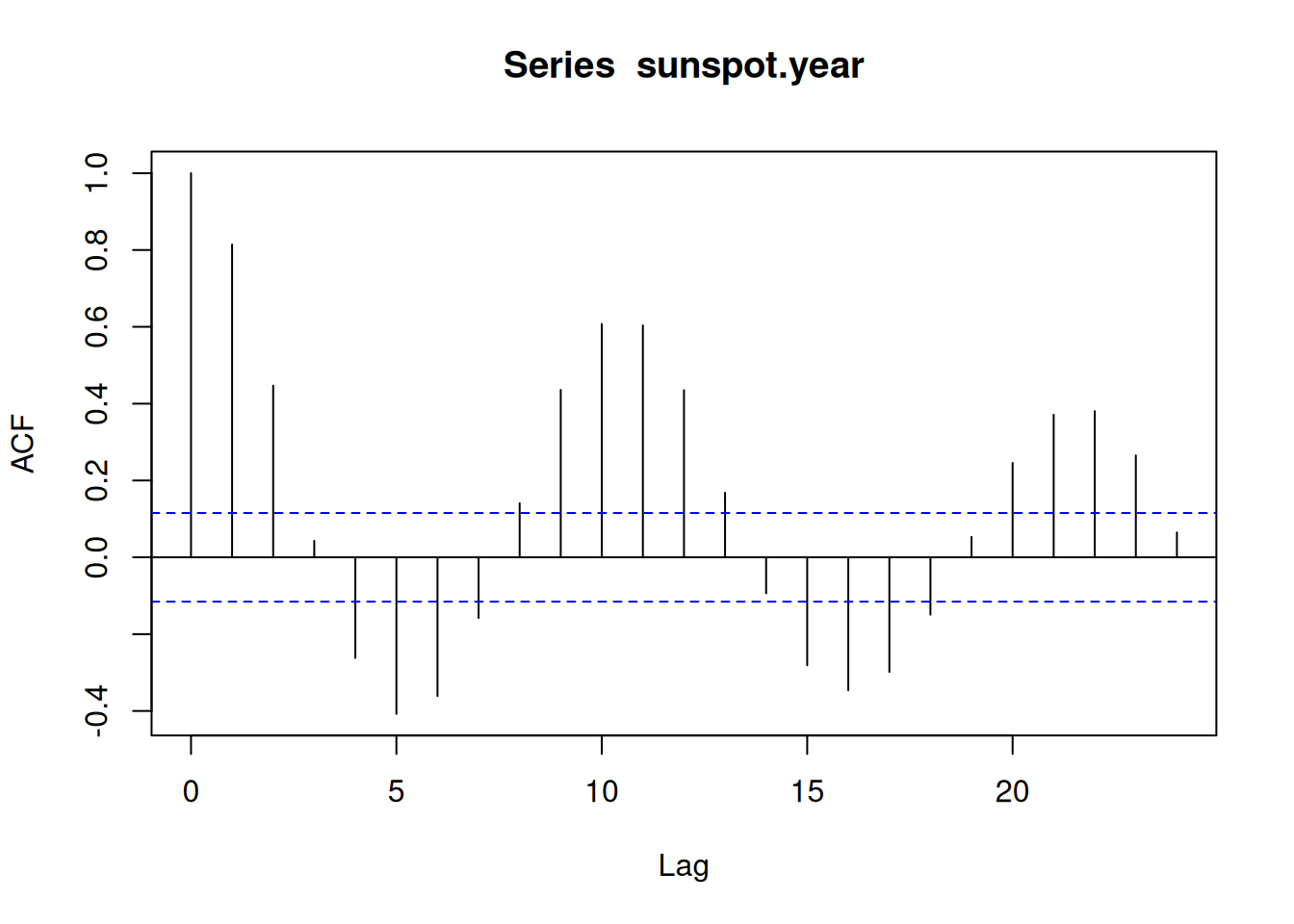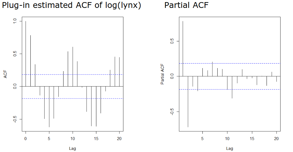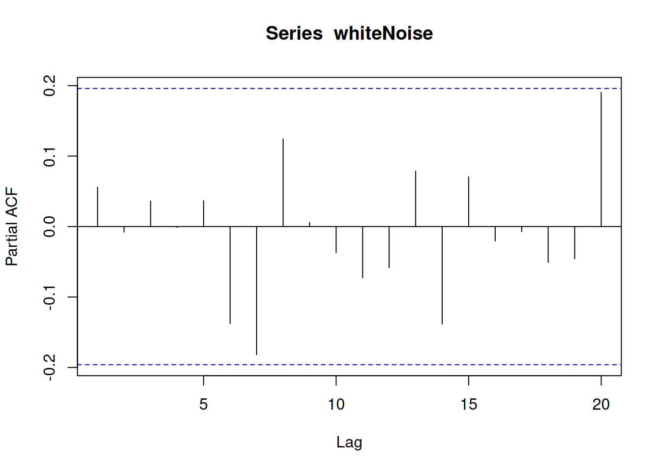A challenge in the interpretation of ACFs is that the effect of smaller lags remains. The partial autocorrelation function (PACF) gives the partial correlation of a stationary time series with its own lagged values, regressed the values of the time series at all shorter lags.