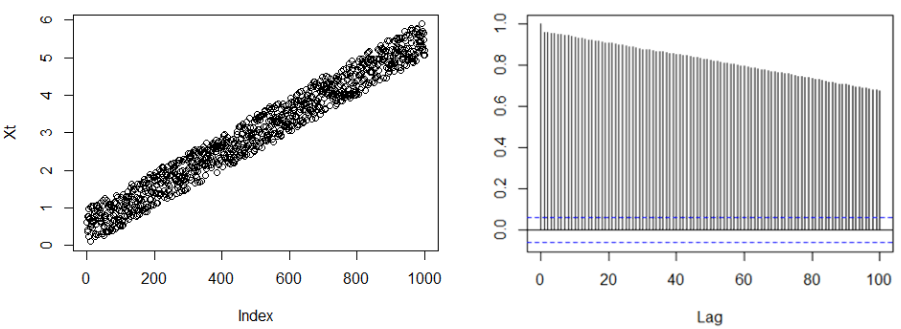 Time series with seasonality and trend, the ACF displays periodicity and slow decay.