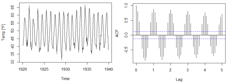 Seasonality manifests itself by a repetitive behavior after a fixed lag time \(p\).