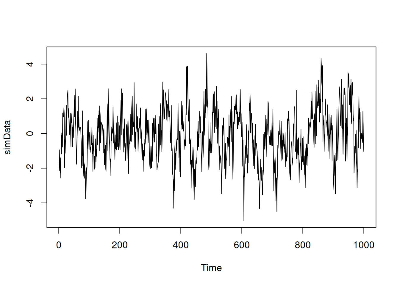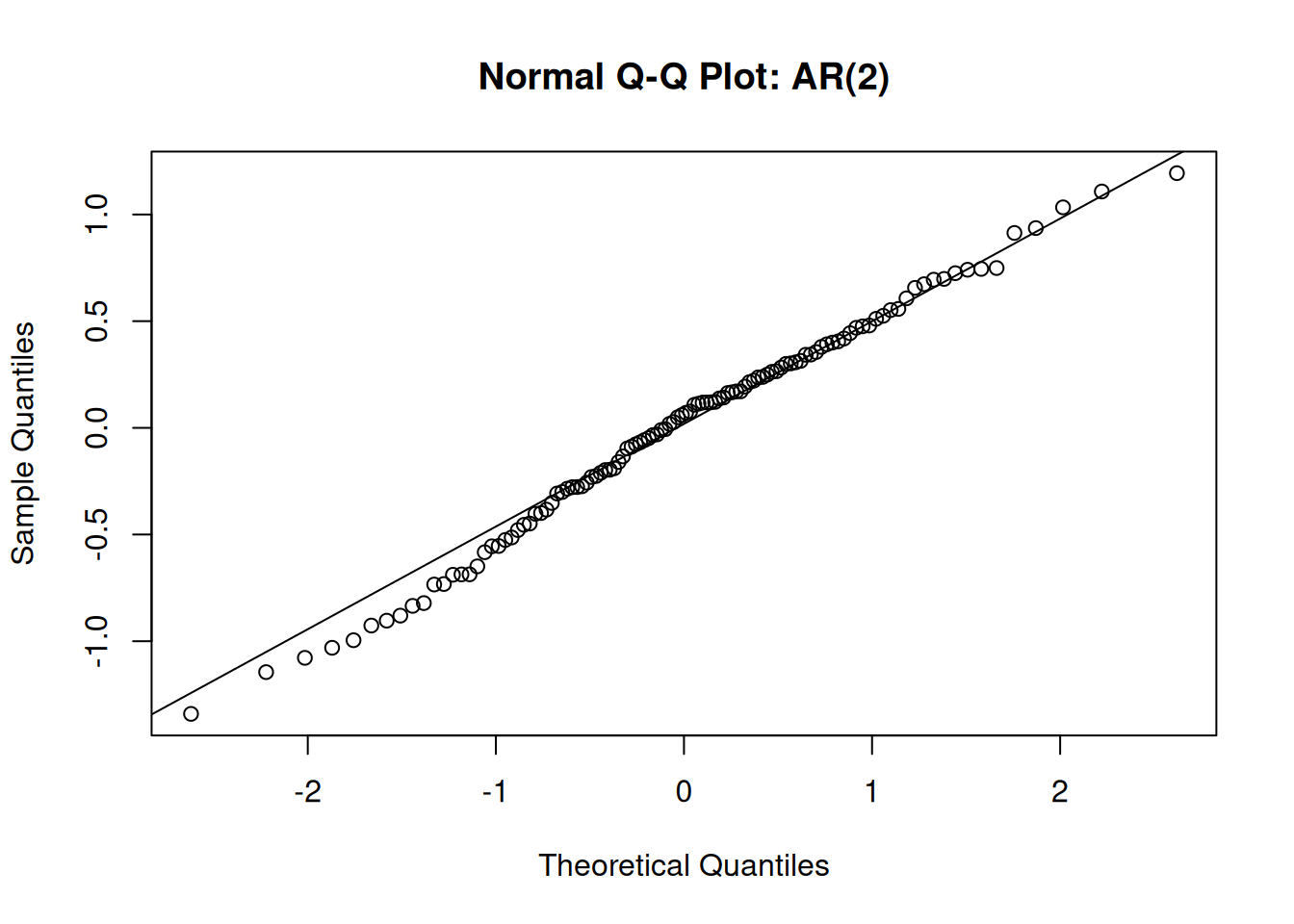 \[ X_t = 0.5 X_{t-1} + 0.3 X_{t-2} + e_t \text{ with } e_t \sim N(0,1) \text{ iid.} \]